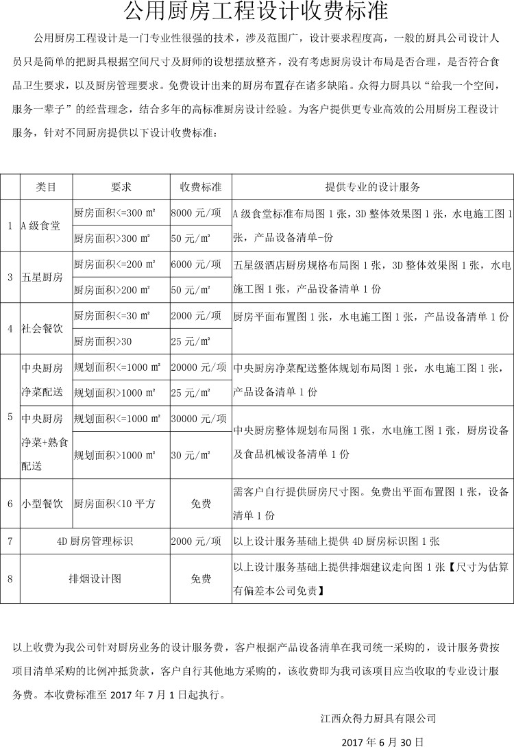 公用廚房工程設計是一門專業性很強的技術,涉及范圍廣,設計要求程度高,一般的廚具公司設計人員只是簡單的把廚具根據空間尺寸及廚師的設想擺放整齊,沒有考慮廚房設計布局是否合理,是否符合食品衛生要求,以及廚房管理要求。免費設計出來的廚房布置存在諸多缺陷。眾得力廚具以“給我一個空間,服務一輩子”的經營理念,結合多年的高標準廚房設計經驗。為客戶提供更專業高效的公用廚房工程設計服務,針對不同廚房提供以下設計收費標準: