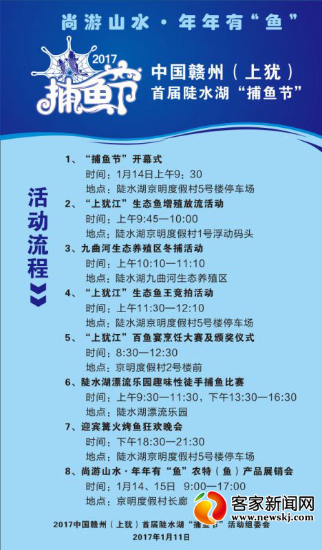 摘自客家新聞網:2017尚游山水·年年有“魚”中國贛州(上猶)首屆陡水湖“捕魚節”盛大啟幕,2017年1月14日-15日兩天時間里,將開展“上猶江”生態魚增殖放流、九曲河生態養殖區冬捕、“上猶江”生態魚王競拍、“上猶江”百魚宴烹飪大賽、篝火烤魚狂歡晚會、陡水湖趣味性徒手捕魚比賽,以及“多彩上猶”魚品、油畫、奇石展銷會等系列活動。
